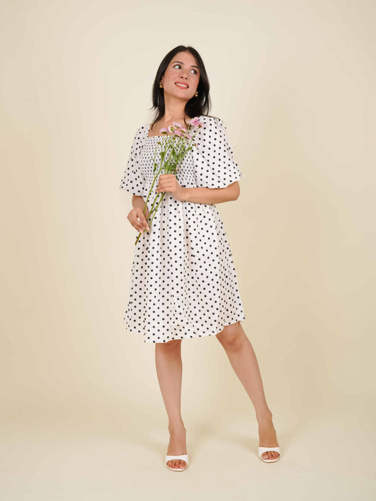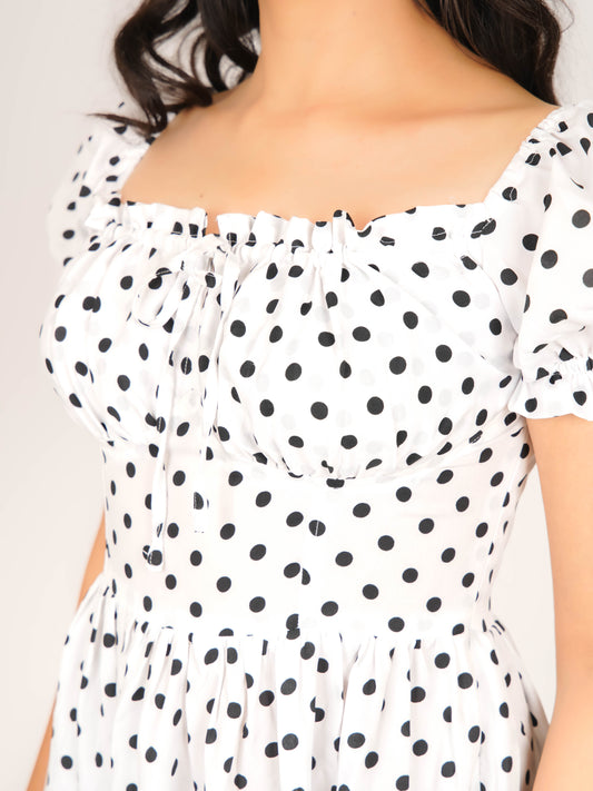 MONOMEE IRIS WHITE POLKA DOT MINI DRESS