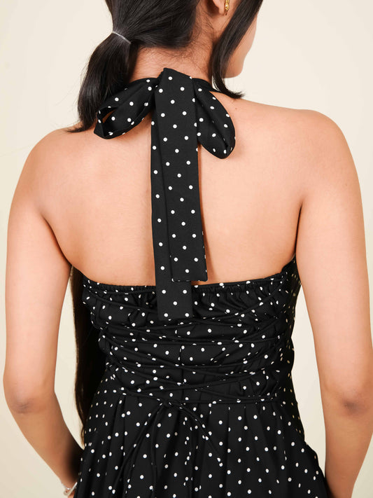 MONOMEE ALOURA BLACK POLKA DOT HALTER NECK DRESS