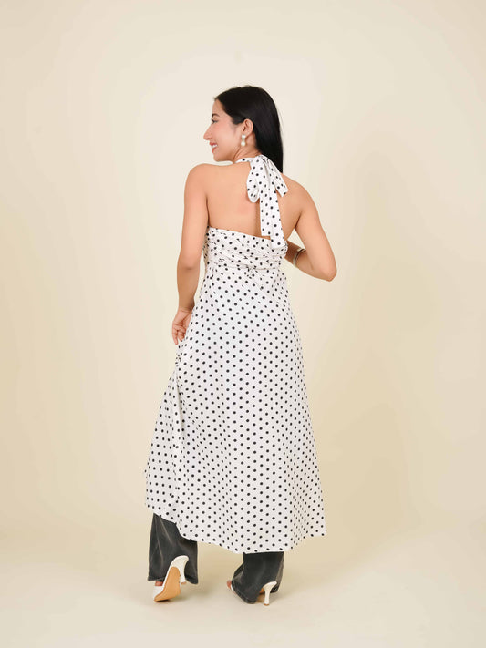 MONOMEE ATHENA WHITE POLKA DOT HALTER NECK DRESS