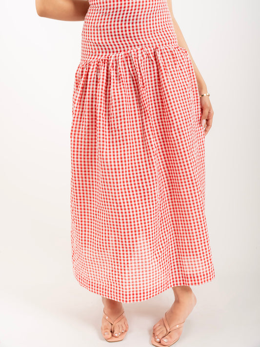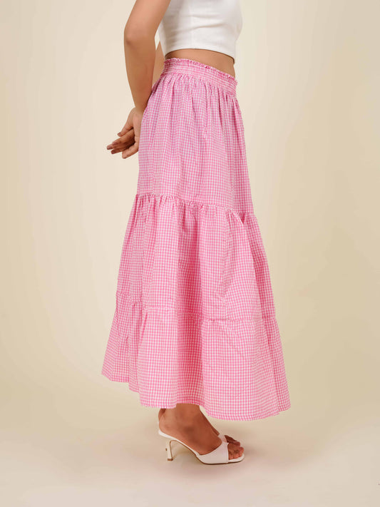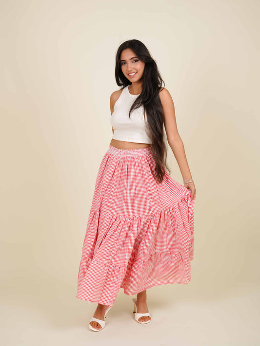 MONOMEE CORA TIERED GINGHAM MAXI SKIRT
