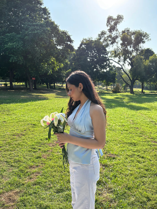 MONOMEE CESCA SATIN HALTER NECK ICE BLUE TOP