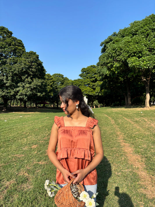 MONOMEE COCO RUST SATIN RUFFLE TUNIC TANK TOP