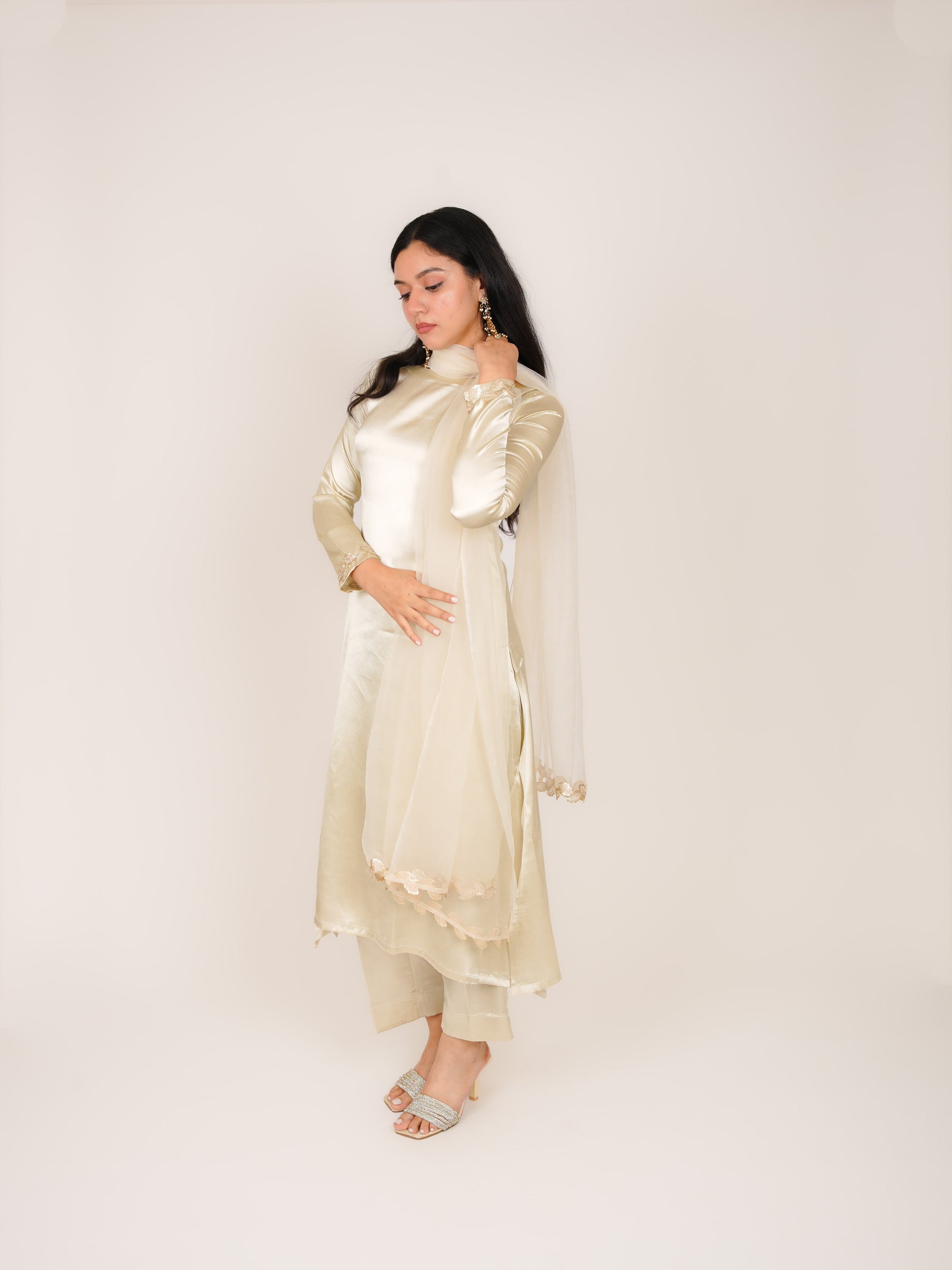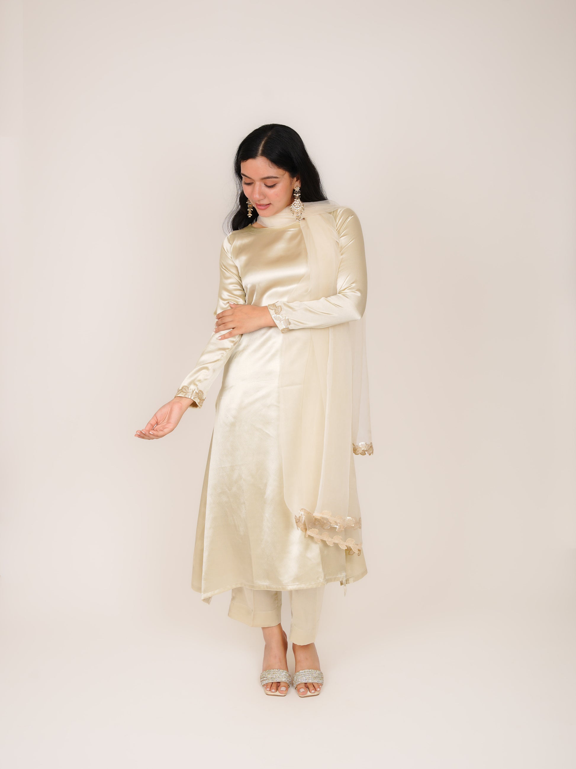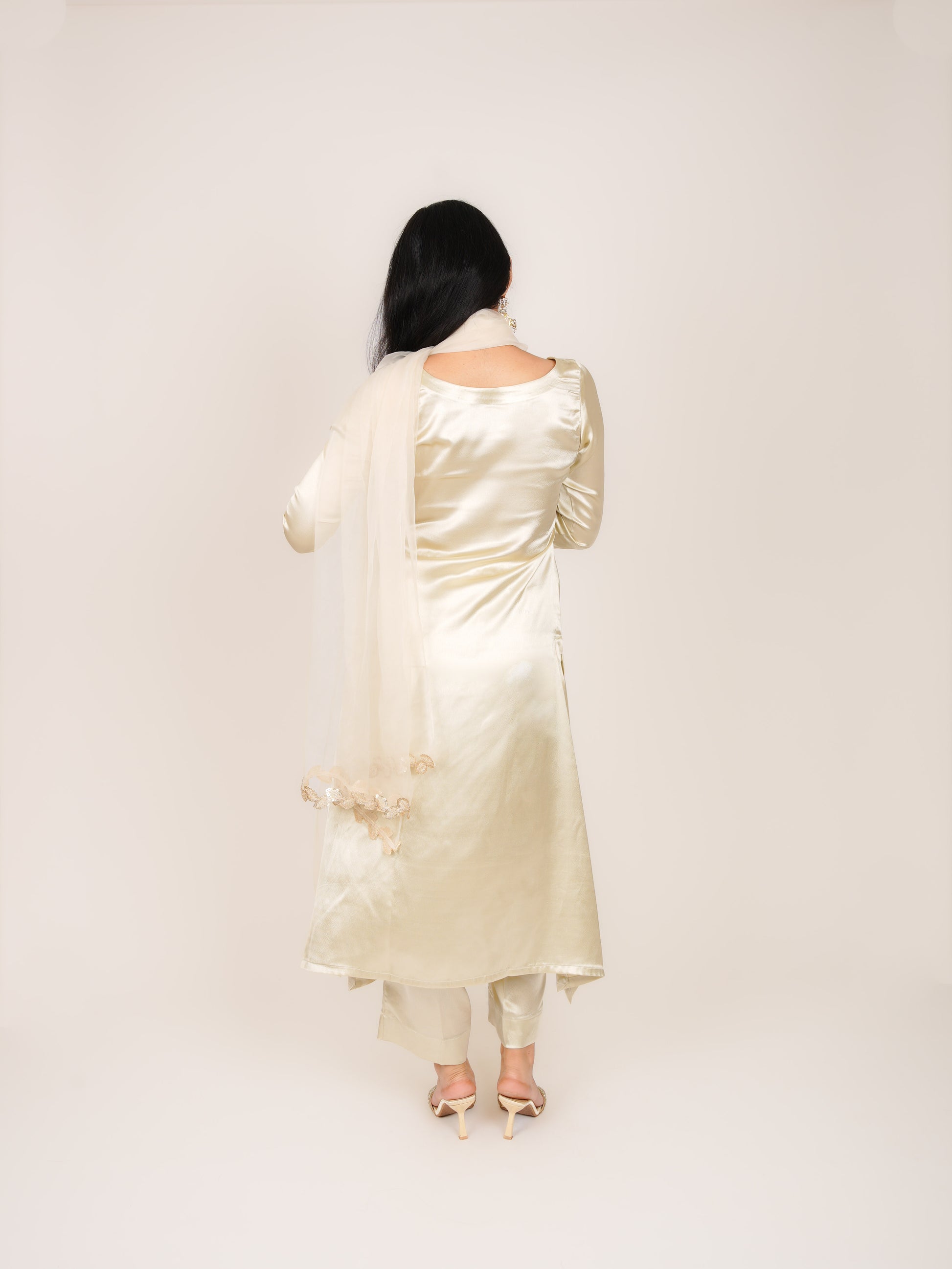 VIHANA OFF-WHITE SATIN A-LINE KURTA WITH TROUSERS & DUPATTA