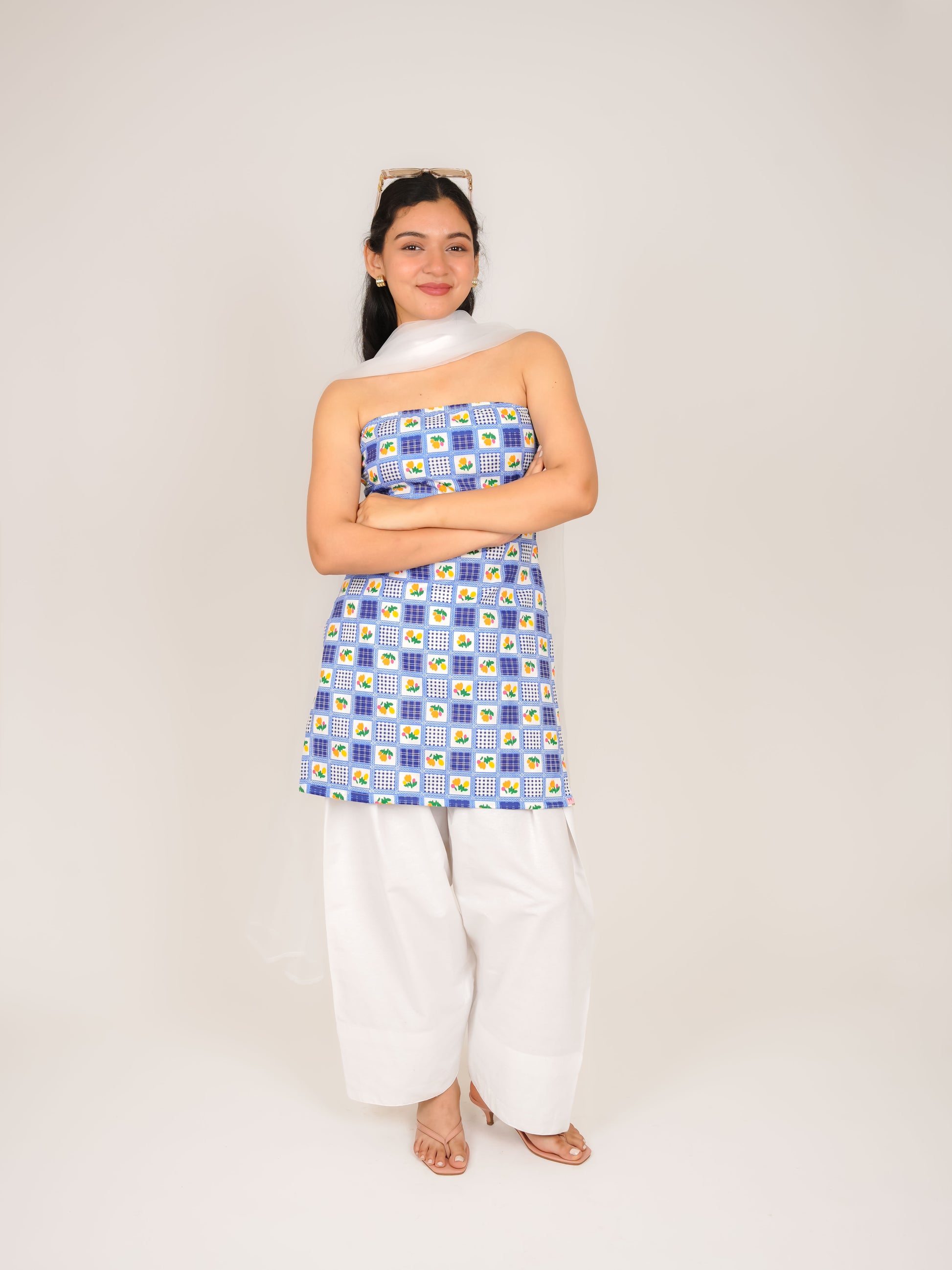 ISHIRA BLUE GINGHAM FARSHI SALWAR SUIT SET WITH DUPATTA