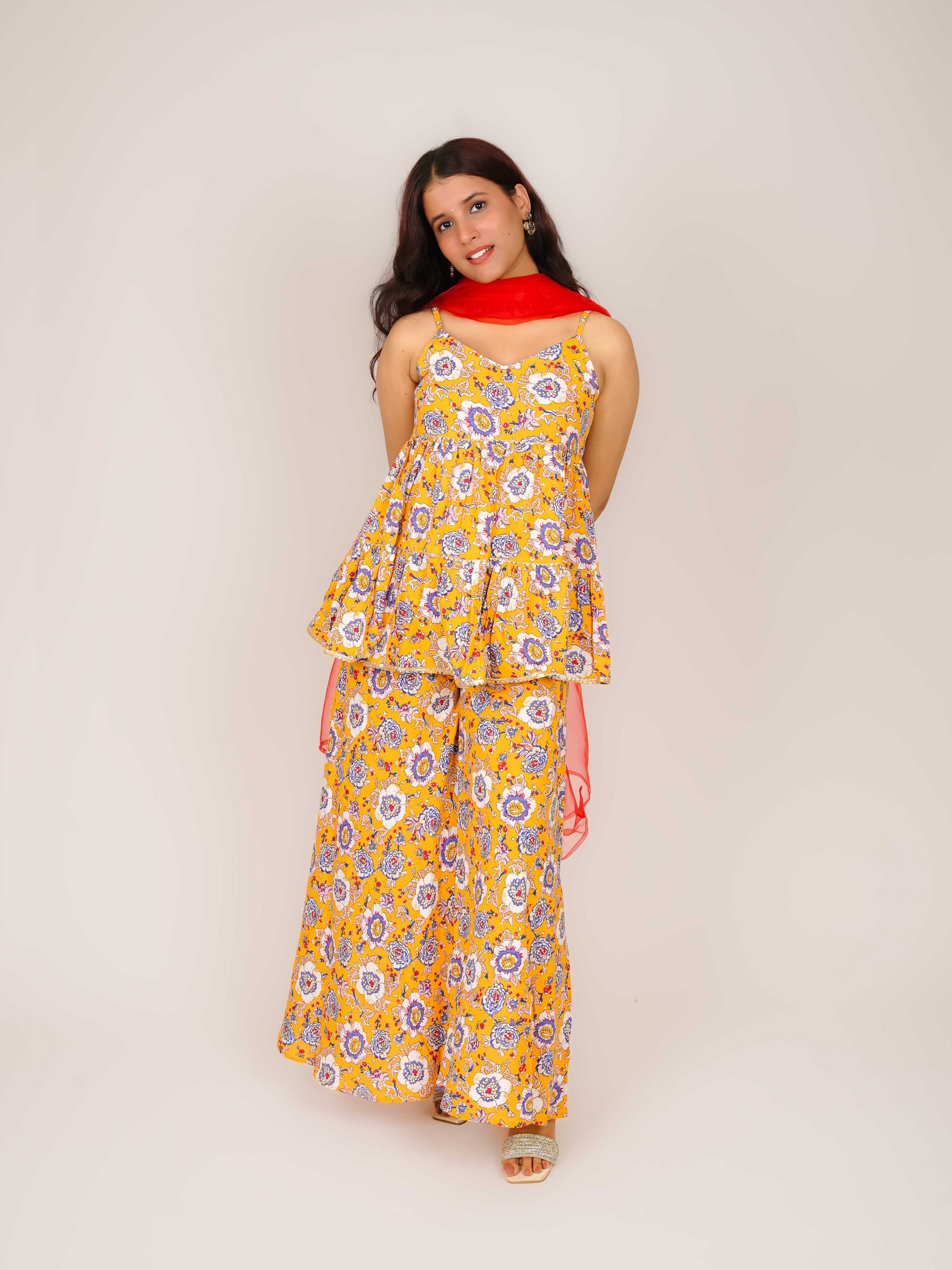 MEHIRA V-NECK SHOULDER STRAPS TIERED A-LINE KURTA WITH PALAZZOS & DUPATTA